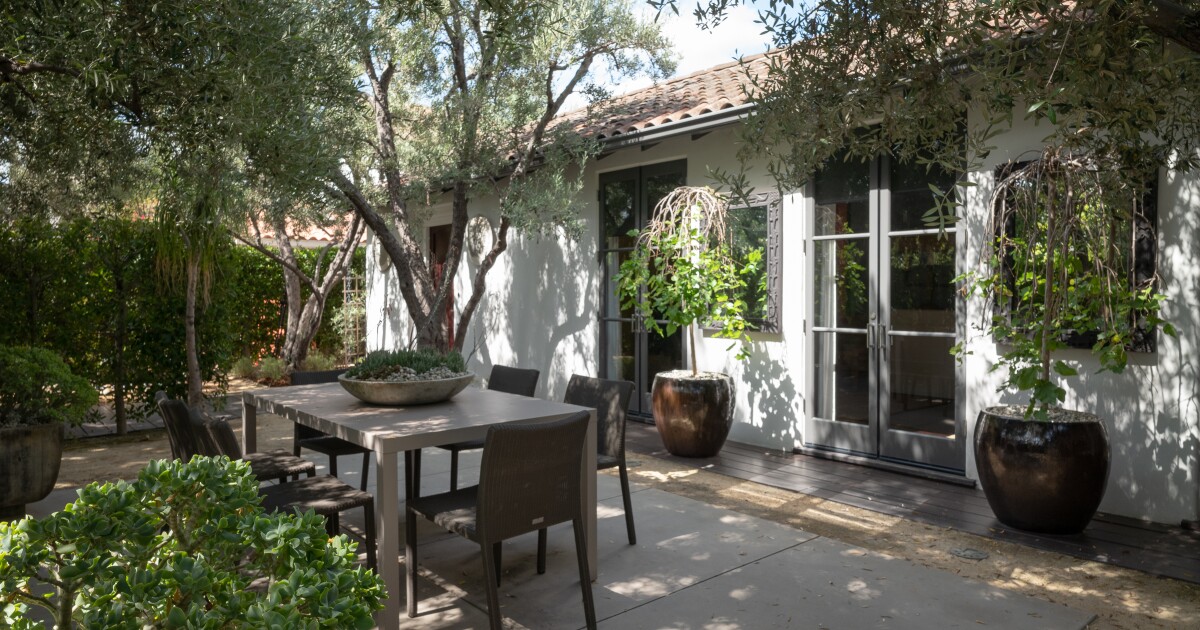 Hedged and gated from the street, the 1920s Spanish-style house was reimagined by Hutt as a spa-like setting. Features include a traditional Norwegian sauna, an outdoor rain shower and a 45-foot saltwater lap pool. Draped cabanas, fountains and an outdoor dining area shaded by olive trees further the experience.